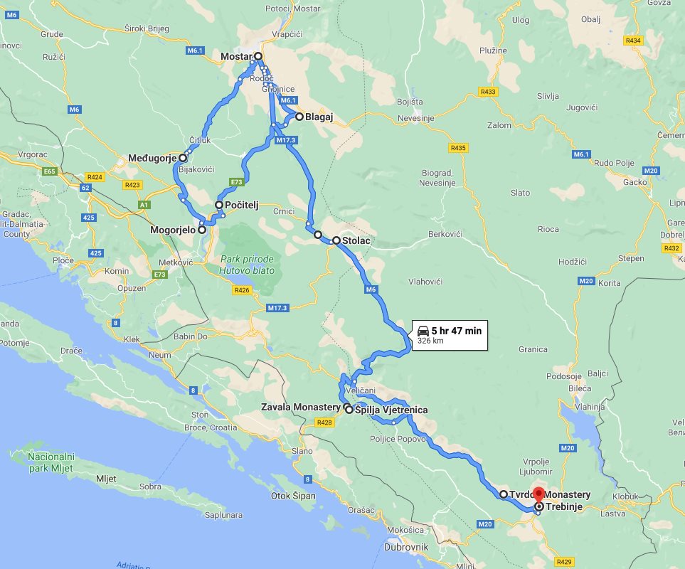 Tour summaryAll seasons Bosnia discovery 3 days tour from Trebinje. Monterrasol Travel small group tour with minivan. Bosnia UNESCO town Mostar and Blagaj, Pocitelj, Vjetrenica, Zavala, Medjugorje, Stolac. This page describes details of the multi-day small group car tour #672 offered by Monterrasol Travel. We, Monterrasol Travel, are an independent tour operator specialized in cultural and destination tourism. This sightseeing tour has been developed by Monterrasol Travel for small groups travelers based on our own experiences and belongs to the group of car tours with pre-designed itineraries. If you like this tour but you would like to change something, please do not hesitate to contact us and mention the ID number of this tour: #672. The custom itinerary will cost you nothing, it's free from our side. The tour will start and finish in Trebinje (Bosnia and Herzegovina) and will take 3 days (2 nights). During this tour you will visit Tvrdoš, Vjetrenica, Zavala, Mostar, Blagaj, Počitelj, Mogorjelo, Međugorje, Radimlja, Stolac located in Bosnia and Herzegovina. Overall, with this tour you will visit 3 UNESCO World Heritage sites and 3 sites from the UNESCO Tentative List (sites that were submitted to the World Heritage Committee, and are awaiting to consider for nomination, and therefore suitable for inscription on the World Heritage List). Additional informationWe will pick you up at any hotel or place, in or around Trebinje. Drop off is the same as pick up, or upon request in another place. We, at Monterrasol Travel, practice the Slow Tourism philosophy. That means that we work our tours at a pace that allows to our clients have a more authentic experience and a true exploring of each destination that features in our itineraries. The default tour price includes rooms in 3-star hotels, which are usually not near historical centers with pedestrian streets. If you would like better accommodation in terms of location and quality level, please contact us. This small group tour is available for solo travelers as well. Please contact us for details. We provide for this tour a special discount for pensioners (seniors citizens). We recommend you consider traveling off-season. Advantages of traveling off-season. Photo galleryPhoto gallery of attractions involved in this tour. Tour descriptionAll seasons Bosnia-Herzegovina discovery 3 days tour from Trebinje to see Mostar and surrounding attractions. During this tour we going to see orthodox monastery Tvrdos with own wine cellars where we will taste local wines, explore the natural cave Vjetrenica (UNESCO Tentative List site), see orthodox monastery Zavala partially located in cave, and finish the fist day walking in historical center of town Mostar (UNESCO World Heritage site) and cross the famous Mostar bridge. The second day we will start with visiting historical town Blagaj with dervish monastery (tekija) built around 1520, after we will walk in historic medieval town Pocitelj, served as open-air museum, with narrow streets and old Ottoman fort with great view, see a real Roman villa Rustica, established as agricultural estate in 4th century AD, and finish this day to walk in pilgrimage center Medjugorje. On the next day we will see archaeological site Radimlja with carved gravestones (UNESCO World Heritage Site) and Stolac hilly fortress with breathtaking view on the valley, and after will return back to Trebinje. Border crossing for this tripThis tour does not require border crossing. Money and paymentsIn each country of your trip you can use main credit and debit cards. You can use ATM to withdrawal cash or pay at purchase point with card. More information on currencies, payments, and use cards you can read on this our page: On the trip: currencies, payments, card use. Last reviewed: 19 September 2021 Tour itineraryTour starts in: Trebinje, Bosnia and Herzegovina day 1: travel to Tvrdos, visit Tvrdos monastery, travel to Vjetrenica to see Vjetrenica cave (UNESCO World Heritage Site), travel to Zavala to see Zavala monastery, travel to Mostar to see Mostar historical center (UNESCO World Heritage Site), for the rest of the day enjoy free time in Mostar; accommodation in Mostar Tour finishes in: Trebinje, Bosnia and Herzegovina Planned distance of this tour: 326 km. What is a good itinerary for a multi-day tourHow to understand if this itinerary is good for you? Read our advice: what is a good itinerary for a multi-day tour. If you like this small group tour and itinerary but you would like to change something, please do not hesitate to contact us and mention the ID number of this tour: #672. We do not charge for development a custom car tour itinerary, it will cost you nothing. We will be glad to discuss with you the details of your future trip and plan it following your ideas and wishes. Visited places during the tourOur tour will pass several towns and places along the route. Each town and place has something to offer from a tourist's point of view. We will stop in each place and explore its attractions. The exact attractions for each place or town can be seen in the tour's itinerary. Here is the list of places visited during this tour, in the order they appear in the itinerary. Tvrdoš (Tvrdos), Bosnia and HerzegovinaKnown for winery, orthodox monastery The famous monastery Tvrdos, located about five kilometers from Trebinje, dates back to the Middle Ages and it is believed that it was founded by the Czar, Saint Constantine, and his mother Saint Helen. The Tvrdos monastery is renowned for its wine production and its wine cellars, with possibility to wine tasting. Vjetrenica, Bosnia and HerzegovinaKnown for cave; cave is a UNESCO World Heritage Site Vjetrenica (the wind cave) is the largest and most important cave in Bosnia-Herzegovina, is a UNESCO World Heritage site, and one of the most important caves in the Dinaric Alps mountain range, which is famous worldwide for its karstic and speleological richness. It is a real treasure in bio