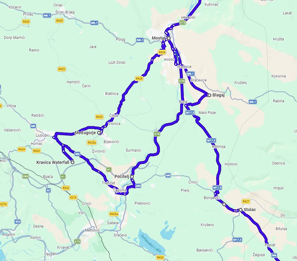 Tour summaryAll seasons Bosnia discovery 6 days tour from Sarajevo. Monterrasol Travel small group tour by minivan. Bosnia: off-the-beaten-path travel example. Land of Ottoman fortresses and Orthodox monasteries. This page describes details of the multi-day small group car tour #618 offered by Monterrasol Travel. We, Monterrasol Travel, are an independent tour operator specialized in cultural and destination tourism. This sightseeing tour has been developed by Monterrasol Travel for small groups travelers based on our own experiences and belongs to the group of car tours with pre-designed itineraries. If you like this tour but you would like to change something, please do not hesitate to contact us and mention the ID number of this tour: #618. The custom itinerary will cost you nothing, it's free from our side. The tour will start and finish in Sarajevo (Bosnia and Herzegovina) and will take 6 days (5 nights). During this tour you will visit Tunnel of Hope, Travnik, Jajce, Šćit, Mostar, Počitelj, Kravica, Međugorje, Blagaj, Radimlja, Vjetrenica, Trebinje, Tvrdoš, Sutjeska National Park located in Bosnia and Herzegovina. Overall, with this tour you will visit 3 UNESCO World Heritage sites and 3 sites from the UNESCO Tentative List (sites that were submitted to the World Heritage Committee, and are awaiting to consider for nomination, and therefore suitable for inscription on the World Heritage List). Additional informationWe will pick you up at any hotel or place, in or around Sarajevo. Drop off is the same as pick up, or upon request in another place. We, at Monterrasol Travel, practice the Slow Tourism philosophy. That means that we work our tours at a pace that allows to our clients have a more authentic experience and a true exploring of each destination that features in our itineraries. The default tour price includes rooms in 3-star hotels, which are usually not near historical centers with pedestrian streets. If you would like better accommodation in terms of location and quality level, please contact us. This small group tour is available for solo travelers as well. Please contact us for details. We provide for this tour a special discount for pensioners (seniors citizens). We recommend you consider traveling off-season. Advantages of traveling off-season. Photo galleryPhoto gallery of attractions involved in this tour. Tour descriptionDay 1. We depart Sarajevo and travel to the Tunnel of Hope Museum, a poignant underground passage that was a lifeline during the city's siege in the 1990s. We then journey to Travnik to explore its imposing Ottoman-era fortress, dating back to the 15th century, and enjoy the scenic Lasva River. After that, we will come to Jajce for accommodation. Day 2. After staying in Jajce, we explore the town's unique natural wonder, the Jajce waterfall, where the Pliva River plunges directly into the Vrbas. We visit the historic medieval fortress, stroll through its charming historical center (UNESCO Tentative List Site), and relax in its scenic park. We stay another night in Jajce. Day 3. After 2 nights in Jajce, we travel to Scit to visit its serene Franciscan (Roman Catholic) monastery, a key spiritual and cultural center, and its insightful museum. Our journey continues south to the iconic city of Mostar to explore its famous historical center (UNESCO World Heritage Site) and the reconstructed 16th-century Stari Most (Old Bridge). We will stay in Mostar. Day 4. After an overnight in Mostar, we travel to the enchanting Ottoman-era hill town of Pocitelj (UNESCO Tentative List Site), renowned for its preserved stone architecture. We then visit the magnificent Kravica waterfalls, a stunning natural amphitheater of cascades. Our day continues to Medjugorje, a world-renowned Roman Catholic pilgrimage center since 1981. After that, we will return to Mostar for accommodation. Day 5. After staying in Mostar, we take a short drive to Blagaj to visit the stunning Dervish monastery (Tekija) (UNESCO Tentative List Site), a 16th-century Sufi (Islamic) retreat. We then visit the remarkable medieval stecci (tombstone) necropolis at Radimlja (UNESCO World Heritage Site). Our journey continues to the fascinating Vjetrenica cave system (UNESCO World Heritage Site). Afterwards, we will come to Trebinje for accommodation. Day 6. After staying in Trebinje, we travel to Tvrdos to explore its Serbian Orthodox monastery, originally founded in the 15th century, and sample local wines at its winery. We return to Trebinje to see its iconic Arslanagica Bridge from the 16th century and explore its charming historical center. Our journey concludes with a scenic drive through the stunning landscapes of Sutjeska National Park before returning to Sarajevo. Border crossing for this tripThis tour does not require border crossing. Money and paymentsIn each country of your trip you can use main credit and debit cards. You can use ATM to withdrawal cash or pay at purchase point with card. More information on currencies, payments, and use cards you can read on this our page: On the trip: currencies, payments, card use. Last reviewed: 17 December 2025 Tour itineraryTour starts in: Sarajevo, Bosnia and Herzegovina day 1: travel to Tunnel of Hope, visit Tunnel of Hope museum, travel to Travnik to see Travnik fortress, visit Travnik river; travel to Jajce for accommodation Tour finishes in: Sarajevo, Bosnia and Herzegovina Planned distance of this tour: 811 km. What is a good itinerary for a multi-day tourHow to understand if this itinerary is good for you? Read our advice: what is a good itinerary for a multi-day tour. If you like this small group tour and itinerary but you would like to change something, please do not hesitate to contact us and mention the ID number of this tour: #618. We do not charge for development a custom car tour itinerary, it will cost you nothing. We will be glad to discuss with you the details of your future trip and plan it following your ideas and wishes. Visited pl
