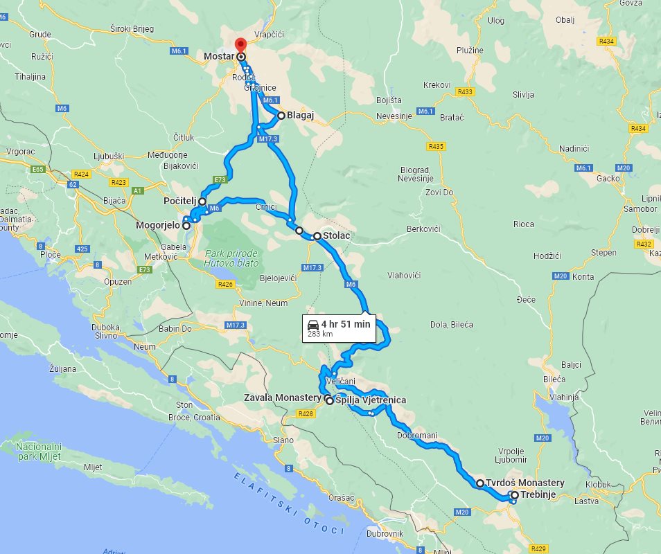 day 1: Blagaj monastery; Radimlja archaeological site; Vjetrenica cave; Zavala monastery; accommodation in Trebinje Tour finishes in: Mostar, Bosnia and Herzegovina Planned distance of this tour: 283 km. Availability of this tourPlease check below for the availability of this small group tour for a specific month and year. In addition, for this tour, a 3 days cut-off period is in effect. Of course, you are always welcome to contact us with questions about availability. Check availability for specific period: