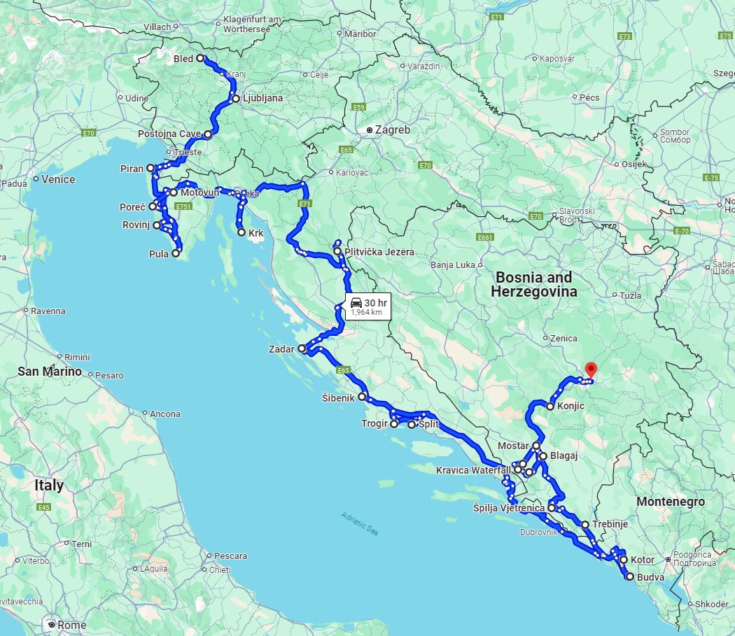 Tour summaryBalkans tour 14 days across Slovenia Croatia Bosnia Montenegro Monterrasol Travel tour with small group minivan. Visit UNESCO sites and main attraction in 4 Balkans countries. This page describes details of the multi-day small group car tour #818 offered by Monterrasol Travel. We, Monterrasol Travel, are an independent tour operator specialized in cultural and destination tourism. This sightseeing tour has been developed by Monterrasol Travel for small groups travelers based on our own experiences and belongs to the group of car tours with pre-designed itineraries. If you like this tour but you would like to change something, please do not hesitate to contact us and mention the ID number of this tour: #818. The custom itinerary will cost you nothing, it's free from our side. The tour will start in Ljubljana (Slovenia) and tour finishes in Sarajevo (Bosnia and Herzegovina), and will take 14 days (13 nights). During this tour you will visit Bled, Postojna, Rovinj, Pula, Poreč, Motovun, Krk, Plitvice, Zadar, Šibenik, Trogir, Split, Dubrovnik, Budva, Kotor, Perast, Trebinje, Tvrdoš, Vjetrenica, Radimlja, Mostar, Blagaj, Počitelj, Kravica, Međugorje, Konjic, Sarajevo located in Slovenia, Croatia, Montenegro, Bosnia and Herzegovina. Overall, with this tour you will visit 15 UNESCO World Heritage sites and 3 sites from the UNESCO Tentative List (sites that were submitted to the World Heritage Committee, and are awaiting to consider for nomination, and therefore suitable for inscription on the World Heritage List). Additional informationWe will pick you up at any hotel or place, in or around Ljubljana. Drop off is possible at any hotel or place, in or around Sarajevo. We, at Monterrasol Travel, practice the Slow Tourism philosophy. That means that we work our tours at a pace that allows to our clients have a more authentic experience and a true exploring of each destination that features in our itineraries. The default tour price includes rooms in 3-star hotels, which are usually not near historical centers with pedestrian streets. If you would like better accommodation in terms of location and quality level, please contact us. This small group tour is available for solo travelers as well. Please contact us for details. We provide for this tour a special discount for pensioners (seniors citizens). We recommend you consider traveling off-season. Advantages of traveling off-season. Photo galleryPhoto gallery of attractions involved in this tour. Tour descriptionWe welcome you to explore 4 Balkans countries, all are parts of former Yugoslavia: Slovenia, Croatia, Bosnia-Herzegovina, and Montenegro. With our 14-day Balkans tour across Slovenia Croatia Bosnia Montenegro you will able to visit in each country the most important UNESCO sites and main attractions. We will passing by beautiful coastal line, drive scenic roads, see castles and fortresses, lakes and caves, admire Venetian and medieval towns, visit monasteries and cathedrals. We waiting you on this Balkans road trip! Border crossing for this tripThis route require border crossing. You must have valid travel document with you. Please check with your embassy which documents are requested for border crossing to Croatia, Montenegro, Bosnia and Herzegovina. Money and paymentsIn each country of your trip you can use main credit and debit cards. You can use ATM to withdrawal cash or pay at purchase point with card. More information on currencies, payments, and use cards you can read on this our page: On the trip: currencies, payments, card use. Last reviewed: 22 March 2025 Tour itineraryTour starts in: Ljubljana, Slovenia day 1: travel to Bled, visit Bled castle, visit Bled island, visit Bled viewpoint; travel to Ljubljana for accommodation Tour finishes in: Sarajevo, Bosnia and Herzegovina Planned distance of this tour: 1964 km. What is a good itinerary for a multi-day tourHow to understand if this itinerary is good for you? Read our advice: what is a good itinerary for a multi-day tour. If you like this small group tour and itinerary but you would like to change something, please do not hesitate to contact us and mention the ID number of this tour: #818. We do not charge for development a custom car tour itinerary, it will cost you nothing. We will be glad to discuss with you the details of your future trip and plan it following your ideas and wishes. Visited places during the tourOur tour will pass several towns and places along the route. Each town and place has something to offer from a tourist's point of view. We will stop in each place and explore its attractions. The exact attractions for each place or town can be seen in the tour's itinerary. Here is the list of places visited during this tour, in the order they appear in the itinerary. Bled, SloveniaKnown for castle, island, lake, landmark, resort Postojna, SloveniaKnown for castle, cave Rovinj, CroatiaKnown for historical center, medieval old town, museum, promenade, venetian empire, viewpoint The quaint mediterranean city situated on the western coast of the Istrian peninsula was one of the most important towns under the Republic of Venice. The Old Town is mostly Venetian, with a maze of tight cobblestone streets and alleys, narrow houses, small squares, archways and medieval gates. The coast of Rovinj has been one of the most visited tourist destination in Croatia. Pula, CroatiaKnown for medieval old town, venetian empire The largest city in Istria and the eighth largest city in Croatia, situated at the southern tip of the peninsula. It is known for its multitude of ancient Roman buildings and its beautiful sea. It houses the best-preserved Roman colosseum (Pula Arena) outside of Italy. Poreč (Porec), CroatiaKnown for byzantine empire, coastal town, historical center, venetian empire, catholic basilica; basilica is a UNESCO World Heritage Site Poreč is almost 2,000 years old town on the western coast of the Istrian peninsula. Its major landmark is the 6th-century Eup