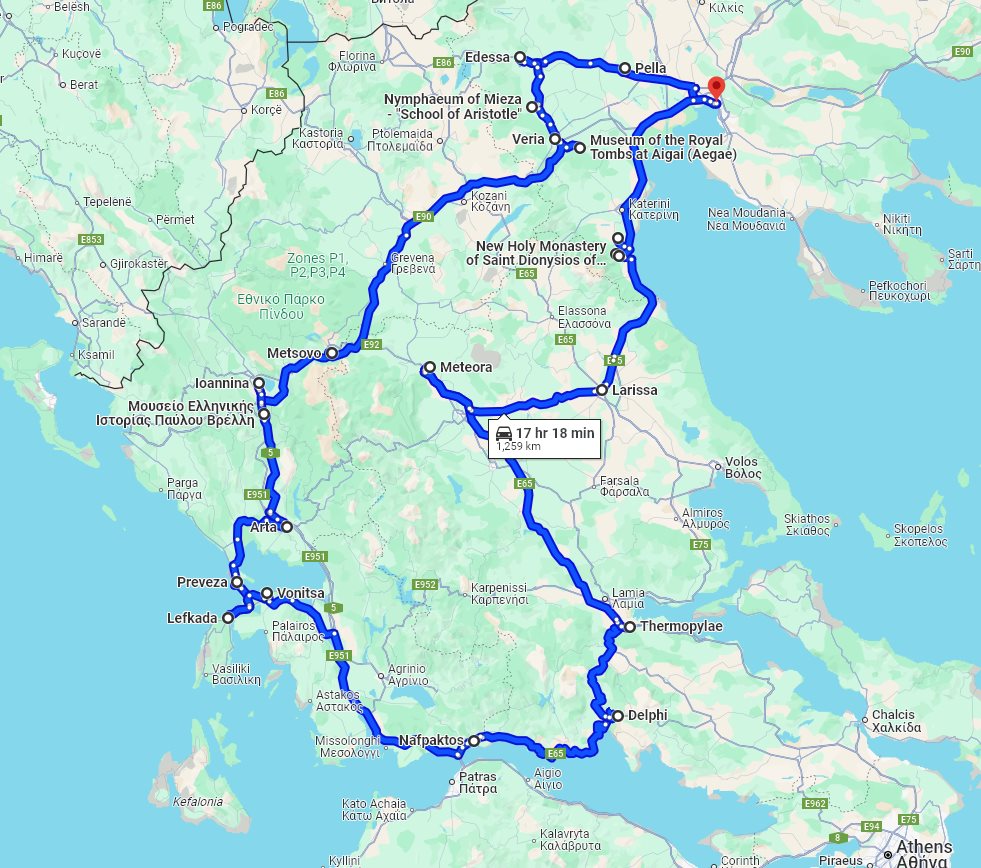 Tour summaryCentral Greece exploring 15 days circle tour from Thessaloniki. Monterrasol Travel small group tour with minivan. Visit the most important attractions of Central Greece. This page describes details of the multi-day small group car tour #828 offered by Monterrasol Travel. We, Monterrasol Travel, are an independent tour operator specialized in cultural and destination tourism. This sightseeing tour has been developed by Monterrasol Travel for small groups travelers based on our own experiences and belongs to the group of car tours with pre-designed itineraries. If you like this tour but you would like to change something, please do not hesitate to contact us and mention the ID number of this tour: #828. The custom itinerary will cost you nothing, it's free from our side. The tour will start and finish in Thessaloniki (Greece) and will take 15 days (14 nights). During this tour you will visit Pella, Edessa, Mieza, Veria, Aigai, Metsovo, Ioannina, Arta, Preveza, Lefkada, Vonitsa, Nafpaktos, Galaxidi, Delphi, Thermopylae, Kalampaka, Meteora, Larissa, Litochoro, Olympus, Dion located in Greece. Overall, with this tour you will visit 3 UNESCO World Heritage sites and 1 site from the UNESCO Tentative List (sites that were submitted to the World Heritage Committee, and are awaiting to consider for nomination, and therefore suitable for inscription on the World Heritage List). Additional informationWe will pick you up at any hotel or place, in or around Thessaloniki. Drop off is the same as pick up, or upon request in another place. We, at Monterrasol Travel, practice the Slow Tourism philosophy. That means that we work our tours at a pace that allows to our clients have a more authentic experience and a true exploring of each destination that features in our itineraries. The default tour price includes rooms in 3-star hotels, which are usually not near historical centers with pedestrian streets. If you would like better accommodation in terms of location and quality level, please contact us. This small group tour is available for solo travelers as well. Please contact us for details. We provide for this tour a special discount for pensioners (seniors citizens). We recommend you consider traveling off-season. Advantages of traveling off-season. Photo galleryPhoto gallery of attractions involved in this tour. Tour descriptionWe welcome you to come with us on a 15-day circle tour to explore Central Greece from Thessaloniki. With this off-season tour, we will visit the most important attractions of Central Greece: famous monasteries, important archaeological sites and museums, historical landmarks, fortresses and waterfalls, mountain and coastal towns. Our tour will start with visiting Pella, where we will explore its archaeological site and museum. From Pella we will come to town Edessa, to explore its attractions, small historical center, archaeological site, and the monastery of Holy Trinity. From Edessa, we will visit the area of Mieza, to see its archaeological site, ancient theater, and historical landmarks related to Aristotle. After Mieza, we will come to see the Byzantine museum in Veria, and see the so-called Podium of Paul the Apostle, the site where he talked with people. Near Veria, we will come to Aegae, inscribed on the UNESCO World Heritage List because of its monumental significance in Western civilization and exceptional architecture. Aegae was the first capital of the Macedonian kingdom and the burial place for their kings, considered to be one of the biggest and most significant places of classical Greece. From Veria, we will come for an overnight stay in the mountain town Metsovo, known for its wine and cheese. Our next destination is Ioannina, where we will see its Ottoman fortress and Silversmith Museum of Weapons and Jewelry. After Ioannina, we will come to Arta to see the archaeological museum and gorgeous Ottoman bridge. On the way to Arta, we plan to visit the famous Paul Vrellis Greek History Museum. We will stay overnight in the coastal town of Preveza. From Preveza, we will take the road through the undersea tunnel to the coastal town of Lefkada, where the territory of the large Lefkada Island starts. In Lefkada town, we will see Faneromeni monastery, enjoy a drive around Lefkada Lagoon, and on the way to Nafpaktos, we will visit the coastal town of Vonitsa to see its fortress and admire the promenade passing along the sea and to the small islet nearby. In Nafpaktos, we will see its fortress overlooking the whole bay, walk its historical center with a small port, and say hello to Miguel de Cervantes. On the way to Delphi, we will stop for lunch in the coastal town Galaxidi. In Delphi (UNESCO World Heritage site), famous in ancient times for its Oracle, we will explore its archaeological site and museum. After Delphi, we will visit King Leonidas in Thermopylae, learn about his legendary battle, and come to Kalampaka. Here we will climb steps of several Meteora monasteries (UNESCO World Heritage site). We will visit all monasteries that are open during these two days. After the Meteora monasteries, we will come to town Larissa, to see its archaeological museum and ancient theater. From Larissa, we will come to the area of Mount Olympus and learn how the area was explored over centuries. We also will visit the large archaeological site Dion and see its archaeological museum and ancient theater. Border crossing for this tripThis tour does not require border crossing. Money and paymentsIn each country of your trip you can use main credit and debit cards. You can use ATM to withdrawal cash or pay at purchase point with card. More information on currencies, payments, and use cards you can read on this our page: On the trip: currencies, payments, card use. Last reviewed: 15 October 2025 Tour itineraryTour starts in: Thessaloniki, Greece day 1: travel to Pella, visit Pella archaeological site, visit Pella museum; travel to Edessa for accommodation Tour finishes in: Th