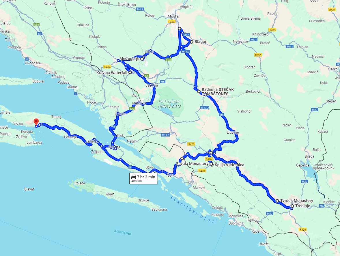 Tour summaryCultural + wine tasting 2 days all seasons Bosnia tour from Korcula. Monterrasol Travel tour in small group minivan. Visit Trebinje, Tvrdos, Blagaj, Medjugorje, Kravica. This page describes details of the multi-day small group car tour #644 offered by Monterrasol Travel. We, Monterrasol Travel, are an independent tour operator specialized in cultural and destination tourism. This sightseeing tour has been developed by Monterrasol Travel for small groups travelers based on our own experiences and belongs to the group of car tours with pre-designed itineraries. If you like this tour but you would like to change something, please do not hesitate to contact us and mention the ID number of this tour: #644. The custom itinerary will cost you nothing, it's free from our side. The tour will start and finish in Korčula (Croatia) and will take 2 days (1 night). During this tour you will visit Vjetrenica, Zavala, Tvrdoš, Trebinje, Radimlja, Blagaj, Međugorje, Kravica located in Bosnia and Herzegovina. Overall, with this tour you will visit 2 UNESCO World Heritage sites and 1 site from the UNESCO Tentative List (sites that were submitted to the World Heritage Committee, and are awaiting to consider for nomination, and therefore suitable for inscription on the World Heritage List). Additional informationWe will pick you up at any hotel or place, in or around Korčula. Drop off is the same as pick up, or upon request in another place. We, at Monterrasol Travel, practice the Slow Tourism philosophy. That means that we work our tours at a pace that allows to our clients have a more authentic experience and a true exploring of each destination that features in our itineraries. The default tour price includes rooms in 3-star hotels, which are usually not near historical centers with pedestrian streets. If you would like better accommodation in terms of location and quality level, please contact us. This small group tour is available for solo travelers as well. Please contact us for details. We provide for this tour a special discount for pensioners (seniors citizens). We recommend you consider traveling off-season. Advantages of traveling off-season. Photo galleryPhoto gallery of attractions involved in this tour. Tour descriptionDiscover Bosnia-Herzegovina and taste wonderful Herzegovina wines with all seasons 2 days Bosnia tour from Korcula (pick up and drop off in Orebic). During the first day we will visit Vjetrenica cave, Orthodox cave monastery Zavala, famous Tvrdos Orthodox monastery and taste real Herzegovina white, rose and red wines from its own wine cellar, admire panoramic view of Trebinje from hilly church, and enjoy small walking tour in Trebinje. On the next day we will take a road to see archaeological site Radimlja with carved gravestones (UNESCO World Heritage Site), admire dervish monastery in Blagaj, visit Medjugorje pilgrimage center, and see famous Kravica waterfalls. After we will enjoy local food with local wine and return back. Border crossing for this tripThis route require border crossing. You must have valid travel document with you. Please check with your embassy which documents are requested for border crossing to Bosnia and Herzegovina. Money and paymentsIn each country of your trip you can use main credit and debit cards. You can use ATM to withdrawal cash or pay at purchase point with card. More information on currencies, payments, and use cards you can read on this our page: On the trip: currencies, payments, card use. Last reviewed: 18 February 2025 Tour itineraryTour starts in: Korčula, Croatia day 1: travel to Vjetrenica, visit Vjetrenica cave (UNESCO World Heritage Site), travel to Zavala to see Zavala monastery, travel to Tvrdos to see Tvrdos monastery, travel to Trebinje to see Trebinje cathedral, visit Trebinje winery; accommodation in Trebinje Tour finishes in: Korčula, Croatia Planned distance of this tour: 408 km. What is a good itinerary for a multi-day tourHow to understand if this itinerary is good for you? Read our advice: what is a good itinerary for a multi-day tour. If you like this small group tour and itinerary but you would like to change something, please do not hesitate to contact us and mention the ID number of this tour: #644. We do not charge for development a custom car tour itinerary, it will cost you nothing. We will be glad to discuss with you the details of your future trip and plan it following your ideas and wishes. Visited places during the tourOur tour will pass several towns and places along the route. Each town and place has something to offer from a tourist's point of view. We will stop in each place and explore its attractions. The exact attractions for each place or town can be seen in the tour's itinerary. Here is the list of places visited during this tour, in the order they appear in the itinerary. Vjetrenica, Bosnia and HerzegovinaKnown for cave; cave is a UNESCO World Heritage Site Vjetrenica (the wind cave) is the largest and most important cave in Bosnia-Herzegovina, is a UNESCO World Heritage site, and one of the most important caves in the Dinaric Alps mountain range, which is famous worldwide for its karstic and speleological richness. It is a real treasure in biodiversity. Also, it is the home to the famous olm (cave aquatic salamander) and houses beautiful cave formations as well. Zavala, Bosnia and HerzegovinaKnown for orthodox monastery An important and historical Serbian Orthodox monastery located in the village of Zavala, approximately 50 km from Trebinje (Republika Srpska). Along with Zitomislic (located near Mostar) and Tvrdos (near the city of Trebinje), Zavala is one of the most prominent monasteries in East Herzegovina. Tvrdoš (Tvrdos), Bosnia and HerzegovinaKnown for winery, orthodox monastery The famous monastery Tvrdos, located about five kilometers from Trebinje, dates back to the Middle Ages and it is believed that it was founded by the Czar, Saint Constantine, and his mother Saint Helen. T