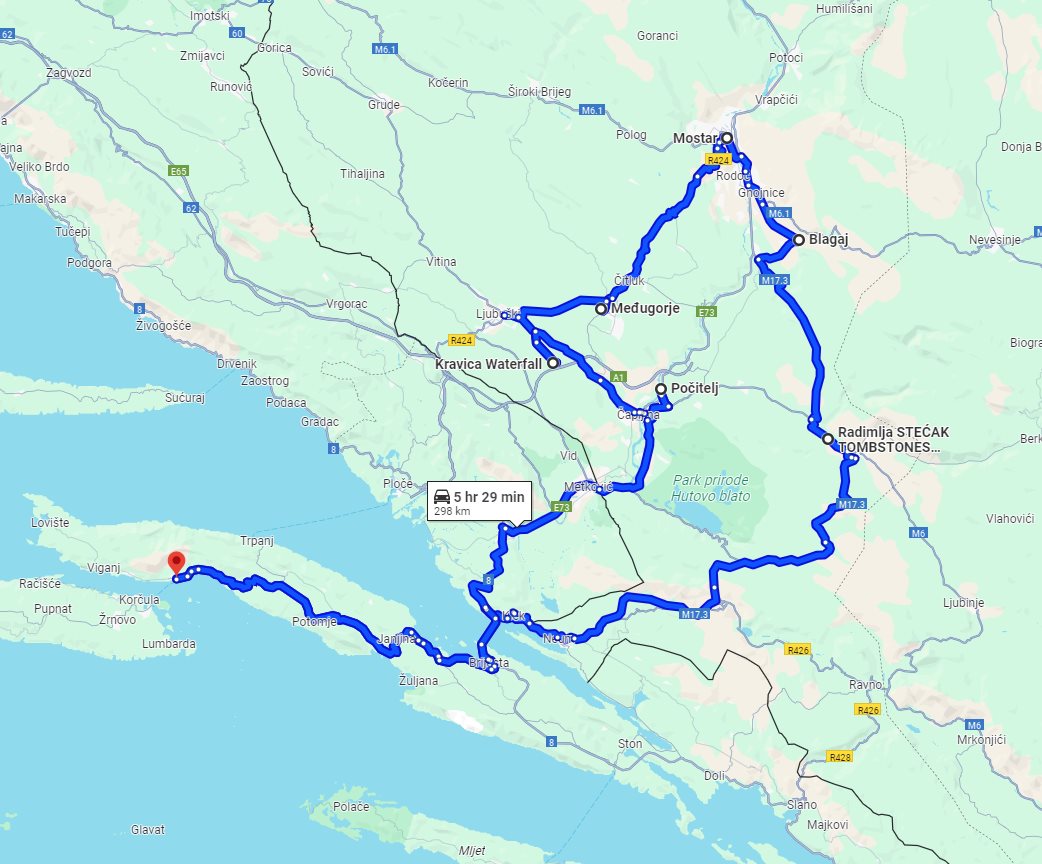 Tour summaryCultural + wine tasting 2 days all seasons Bosnia tour from Korcula. Monterrasol Travel tour in small group minivan. Visit Mostar, Medjugorje, Blagaj, Pocitelj, Kravica. This page describes details of the multi-day small group car tour #645 offered by Monterrasol Travel. We, Monterrasol Travel, are an independent tour operator specialized in cultural and destination tourism. This sightseeing tour has been developed by Monterrasol Travel for small groups travelers based on our own experiences and belongs to the group of car tours with pre-designed itineraries. If you like this tour but you would like to change something, please do not hesitate to contact us and mention the ID number of this tour: #645. The custom itinerary will cost you nothing, it's free from our side. The tour will start and finish in Korčula (Croatia) and will take 2 days (1 night). During this tour you will visit Radimlja, Blagaj, Mostar, Međugorje, Kravica, Počitelj located in Bosnia and Herzegovina. Overall, with this tour you will visit 2 UNESCO World Heritage sites and 2 sites from the UNESCO Tentative List (sites that were submitted to the World Heritage Committee, and are awaiting to consider for nomination, and therefore suitable for inscription on the World Heritage List). Additional informationWe will pick you up at any hotel or place, in or around Korčula. Drop off is the same as pick up, or upon request in another place. We, at Monterrasol Travel, practice the Slow Tourism philosophy. That means that we work our tours at a pace that allows to our clients have a more authentic experience and a true exploring of each destination that features in our itineraries. The default tour price includes rooms in 3-star hotels, which are usually not near historical centers with pedestrian streets. If you would like better accommodation in terms of location and quality level, please contact us. This small group tour is available for solo travelers as well. Please contact us for details. We provide for this tour a special discount for pensioners (seniors citizens). We recommend you consider traveling off-season. Advantages of traveling off-season. Photo galleryPhoto gallery of attractions involved in this tour. Tour descriptionDiscover Bosnia-Herzegovina and taste wonderful Herzegovina wines with all seasons 2 days Bosnia tour from Korcula (pick up and drop off in Orebic). We will visit archaeological site Radimlja with carved gravestones of forgotten religion (UNESCO World Heritage Site), admire dervish monastery in Blagaj, and spend rest of the day walking historical center of Mostar and Mostar Old Bridge (UNESCO World Heritage Site). On the next day we will take a road to see Medjugorje pilgrimage center, walk in natural park with famous Kravica waterfalls, and visit medieval town Pocitelj to walk small streets and enjoy panoramic view from the Ottoman fort. After we will enjoy local food with local wine and return back. Border crossing for this tripThis route require border crossing. You must have valid travel document with you. Please check with your embassy which documents are requested for border crossing to Bosnia and Herzegovina. Money and paymentsIn each country of your trip you can use main credit and debit cards. You can use ATM to withdrawal cash or pay at purchase point with card. More information on currencies, payments, and use cards you can read on this our page: On the trip: currencies, payments, card use. Last reviewed: 18 February 2025 Tour itineraryTour starts in: Korčula, Croatia day 1: travel to Radimlja, visit Radimlja archaeological site (UNESCO World Heritage Site), travel to Blagaj to see Blagaj monastery (UNESCO Tentative List Site), travel to Mostar to see Mostar historical center (UNESCO World Heritage Site), visit Mostar bridge; accommodation in Mostar Tour finishes in: Korčula, Croatia Planned distance of this tour: 298 km. What is a good itinerary for a multi-day tourHow to understand if this itinerary is good for you? Read our advice: what is a good itinerary for a multi-day tour. If you like this small group tour and itinerary but you would like to change something, please do not hesitate to contact us and mention the ID number of this tour: #645. We do not charge for development a custom car tour itinerary, it will cost you nothing. We will be glad to discuss with you the details of your future trip and plan it following your ideas and wishes. Visited places during the tourOur tour will pass several towns and places along the route. Each town and place has something to offer from a tourist's point of view. We will stop in each place and explore its attractions. The exact attractions for each place or town can be seen in the tour's itinerary. Here is the list of places visited during this tour, in the order they appear in the itinerary. Radimlja, Bosnia and HerzegovinaKnown for archaeological site; archaeological site is a UNESCO World Heritage Site Radimlja is a main UNESCO World Heritage Site where is possible to see so called Stecci, a monumental medieval tombstones. Radimlja necropolis located near town Stolac, Bosnia and Herzegovina, and is one of the most valuable monuments of the medieval period in Bosnia and Herzegovina. Blagaj, Bosnia and HerzegovinaKnown for architecture, bridge, cave, fortress, landmark, museum, river, viewpoint, islam monastery; monastery is a UNESCO Tentative List Site Blagaj is a village in the Herzegovina-Neretva Canton of Bosnia-Herzegovina, located in about 15 km from Mostar, and is one of the most valuable mixed urban and rural built environments in Bosnia-Herzegovina. Blagaj has eleven national monuments, and is famous for the spring of the Buna river coming from cave, historical Dervish monastery (tekija) built around 1520, and medieval fortress Blagaj Fort, town-fortress complex built on a 310 meters high karst hill. Blagaj is also known as a residential area of Bosnian rulers and royal families. Mostar, Bosnia and HerzegovinaKnown 