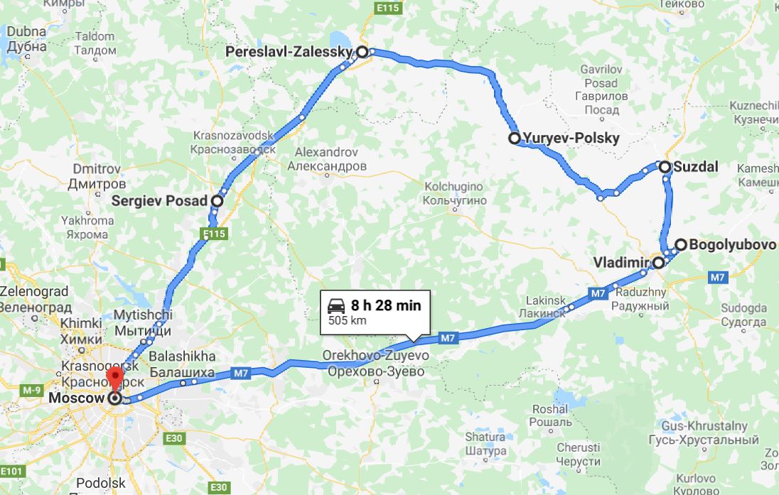 Tour summaryGolden Ring Russia small tour 5 days from Moscow. Small group car tour by Monterrasol Travel. Visit 6 historical russian towns from famous Golden Ring. This page describes details of the multi-day small group car tour #583 offered by Monterrasol Travel. We, Monterrasol Travel, are an independent tour operator specialized in cultural and destination tourism. This sightseeing tour has been developed by Monterrasol Travel for small groups travelers based on our own experiences and belongs to the group of car tours with pre-designed itineraries. If you like this tour but you would like to change something, please do not hesitate to contact us and mention the ID number of this tour: #583. The custom itinerary will cost you nothing, it's free from our side. The tour will start and finish in Москва (Russia) and will take 5 days (4 nights). During this tour you will visit Владимир, Боголюбово, Суздаль, Юрьев-Польский, Переславль-Залесский, Сергиев Посад located in Russia. Overall, with this tour you will visit 5 UNESCO World Heritage sites. Additional informationWe will pick you up at any hotel or place, in or around Москва. Drop off is the same as pick up, or upon request in another place. We, at Monterrasol Travel, practice the Slow Tourism philosophy. That means that we work our tours at a pace that allows to our clients have a more authentic experience and a true exploring of each destination that features in our itineraries. The default tour price includes rooms in 3-star hotels, which are usually not near historical centers with pedestrian streets. If you would like better accommodation in terms of location and quality level, please contact us. This small group tour is available for solo travelers as well. Please contact us for details. We provide for this tour a special discount for pensioners (seniors citizens). We recommend you consider traveling off-season. Advantages of traveling off-season. Photo galleryPhoto gallery of attractions involved in this tour. Tour descriptionThis 5 days tour cover 6 historical towns of famous the Golden Ring, a cluster of ancient towns. All visited towns have rich history, beautiful churches and cathedrals, and full of spirit real russian soul. Border crossing for this tripThis tour does not require border crossing. Money and paymentsIn each country of your trip you can use main credit and debit cards. You can use ATM to withdrawal cash or pay at purchase point with card. More information on currencies, payments, and use cards you can read on this our page: On the trip: currencies, payments, card use. Last reviewed: 26 September 2021 Tour itineraryTour starts in: Москва, Russia day 1: travel to Vladimir, visit Vladimir historical center, visit Vladimir monastery (UNESCO World Heritage Site), for the rest of the day enjoy free time in Vladimir; accommodation in Vladimir Tour finishes in: Москва, Russia Planned distance of this tour: 505 km. What is a good itinerary for a multi-day tourHow to understand if this itinerary is good for you? Read our advice: what is a good itinerary for a multi-day tour. If you like this small group tour and itinerary but you would like to change something, please do not hesitate to contact us and mention the ID number of this tour: #583. We do not charge for development a custom car tour itinerary, it will cost you nothing. We will be glad to discuss with you the details of your future trip and plan it following your ideas and wishes. Visited places during the tourOur tour will pass several towns and places along the route. Each town and place has something to offer from a tourist's point of view. We will stop in each place and explore its attractions. The exact attractions for each place or town can be seen in the tour's itinerary. Here is the list of places visited during this tour, in the order they appear in the itinerary. Владимир (Vladimir), RussiaKnown for landmark; monastery is a UNESCO World Heritage Site Vladimir, dreamy and quiet at the same time, offers a variety of attractions and several UNESCO World Heritage Sites. It has a notable significance in Russian history, as it served as the country's capital city in the 12th-13th centuries. Боголюбово (Bogolyubovo), RussiaKnown for landmark; church is a UNESCO World Heritage Site If you want to see some truly breathtaking religious buildings, Russia is the place you should choose for your next trip. For over a thousand years, Russians have spared no expense when constructing some outstanding places of worship. Суздаль (Suzdal), RussiaKnown for landmark; monastery is a UNESCO World Heritage Site Suzdal, a charming little town that boasts a 10th-century Kremlin, numerous churches and five monasteries, including Spaso-Yevfimiev Monastery. Юрьев-Польский (Yuryev-Polsky), RussiaKnown for landmark; church is a UNESCO World Heritage Site Yuryev-Polsky is home to the unique 13th century white-stone Cathedral of St. George. It is one of just a dozen of these white-stone churches built in northeastern Russia before the Mongol invasion. Переславль-Залесский (Pereslavl-Zalessky), RussiaKnown for lake, landmark, river Beautifully located on Lake Pleshcheevo, Pereslavl-Zalessky is home to the Transfiguration Cathedral, where Prince Alexander Nevsky was baptized. Visitors can also take in the original boat created by Peter the Great in 1692. Сергиев Посад (Sergiyev Posad), RussiaKnown for landmark; monastery is a UNESCO World Heritage Site Sergiyev Posad, included on the famous Golden Ring route of ancient towns, is rich with historic and cultural heritage, as well as boasting a small town charm. The Trinity Lavra of St. Sergius, an UNESCO World Heritage Site, is undeniably the major draw for the city and the symbol of Russian Christianity. #583 Tour mapTour starts in: Москва, Russia