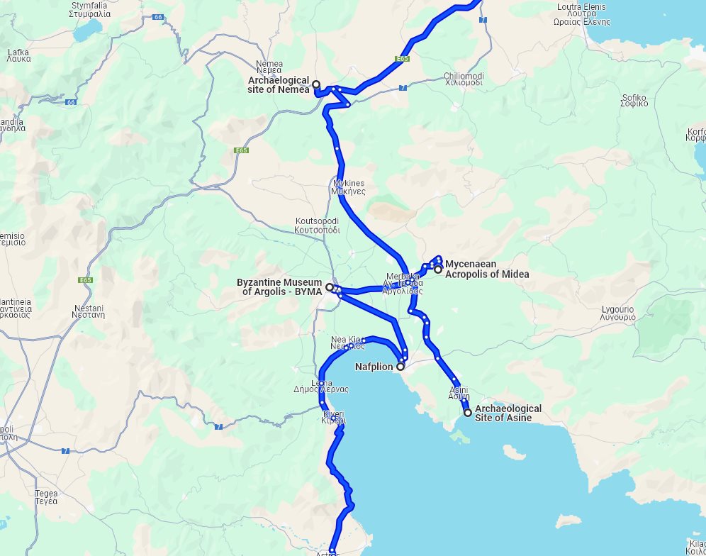 day 1: Corinth canal viewpoint, Corinth, Diolkos landmark, Nemea archaeological site; accommodation in Nafplio Tour finishes in: Igoumenitsa, Greece Planned distance of this tour: 1239 km. #809 Tour maps detailedDue to the length and duration of this route, we were unable to put all the tour attractions on one map. Instead of one general map, here are a few detailed maps of this tour. Detailed map for part: Nafplio area Detailed map for part: Dimitsana area Availability of this tourPlease check below for the availability of this small group tour for a specific month and year. In addition, for this tour, a 45 days cut-off period is in effect. Of course, you are always welcome to contact us with questions about availability. Check availability for specific period: