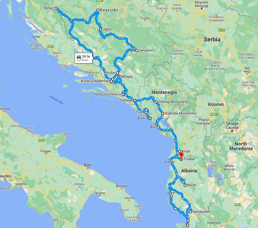 Tour summaryOff-season 23 days Montenegro +Bosnia +Albania tour from Tivat. Monterrasol Travel tour with small group minivan. Scenic Balkans off the beaten path. This page describes details of the multi-day small group car tour #774 offered by Monterrasol Travel. We, Monterrasol Travel, are an independent tour operator specialized in cultural and destination tourism. This sightseeing tour has been developed by Monterrasol Travel for small groups travelers based on our own experiences and belongs to the group of car tours with pre-designed itineraries. If you like this tour but you would like to change something, please do not hesitate to contact us and mention the ID number of this tour: #774. The custom itinerary will cost you nothing, it's free from our side. The tour will start in Tivat (Montenegro) and tour finishes in Tirana (Albania), and will take 23 days (22 nights). During this tour you will visit Budva, Kotor, Risan, Perast, Trebinje, Tvrdoš, Vjetrenica, Radimlja, Mostar, Blagaj, Počitelj, Kravica, Međugorje, Konjic, Sarajevo, Travnik, Jajce, Ključ, Una National Park, Štrbački buk, Bihać, Martin Brod, Livno, Mogorjelo, Stolac, Nikšić, Ostrog, Podgorica, Dajbabe, Stari Bar, Shkodër, Lezhë, Krujë, Durrës, Divjakë, Berat, Apollonia, Vlorë, Llogara pass, Himarë, Borsh, Sarandë, Butrint, Ksamil, Gjirokastër, Tepelenë located in Montenegro, Bosnia and Herzegovina, Albania. Overall, with this tour you will visit 11 UNESCO World Heritage sites and 7 sites from the UNESCO Tentative List (sites that were submitted to the World Heritage Committee, and are awaiting to consider for nomination, and therefore suitable for inscription on the World Heritage List). Additional informationWe will pick you up at any hotel or place, in or around Tivat. Drop off is possible at any hotel or place, in or around Tirana. We, at Monterrasol Travel, practice the Slow Tourism philosophy. That means that we work our tours at a pace that allows to our clients have a more authentic experience and a true exploring of each destination that features in our itineraries. The default tour price includes rooms in 3-star hotels, which are usually not near historical centers with pedestrian streets. If you would like better accommodation in terms of location and quality level, please contact us. This small group tour is available for solo travelers as well. Please contact us for details. We provide for this tour a special discount for pensioners (seniors citizens). We recommend you consider traveling off-season. Advantages of traveling off-season. Photo galleryPhoto gallery of attractions involved in this tour. Tour descriptionWe welcome you to travel with us and discover 3 Balkans countries: Montenegro, Bosnia-Herzegovina, and Albania. Scenic Balkans off-season 23 days tour from Tivat, off the beaten path, with many non-touristy sites. Explore the most important attractions in each country in safe and secure manner, out of crowd, in your pace. With this tour we going to walk in streets of medieval old towns, climb on walls of Ottoman fortress and castles, refresh in parks, admire the beauty of waterfalls, enjoy local food and local wine, admire scenic roads and panoramic views from the hills and mountains, wonder in silent monasteries, visit few UNESCO World Heritage sites, and all that across three Balkans countries definitely worth to see. Border crossing for this tripThis route require border crossing. You must have valid travel document with you. Please check with your embassy which documents are requested for border crossing to Bosnia and Herzegovina, Albania. Money and paymentsIn each country of your trip you can use main credit and debit cards. You can use ATM to withdrawal cash or pay at purchase point with card. More information on currencies, payments, and use cards you can read on this our page: On the trip: currencies, payments, card use. Last reviewed: 2 October 2022 Tour itineraryTour starts in: Tivat, Montenegro day 1: travel to Budva, visit Budva historical center, visit Budva monastery; accommodation in Budva Tour finishes in: Tirana, Albania Planned distance of this tour: 2278 km. What is a good itinerary for a multi-day tourHow to understand if this itinerary is good for you? Read our advice: what is a good itinerary for a multi-day tour. If you like this small group tour and itinerary but you would like to change something, please do not hesitate to contact us and mention the ID number of this tour: #774. We do not charge for development a custom car tour itinerary, it will cost you nothing. We will be glad to discuss with you the details of your future trip and plan it following your ideas and wishes. Visited places during the tourOur tour will pass several towns and places along the route. Each town and place has something to offer from a tourist's point of view. We will stop in each place and explore its attractions. The exact attractions for each place or town can be seen in the tour's itinerary. Here is the list of places visited during this tour, in the order they appear in the itinerary. Budva, MontenegroKnown for coastal town, marina, medieval old town, monument, museum, promenade, venetian empire Budva is a Montenegrin town on the Adriatic Sea, known for its well-preserved medieval walled city, sandy beaches and diverse nightlife. Budva is 2,500 years old, which makes it one of the oldest settlements on the Adriatic coast. The coastal area around Budva called the Budva riviera. Kotor, MontenegroKnown for coastal town, fortified town, fortress, marina, museum, promenade, venetian empire, viewpoint, orthodox church, catholic cathedral, franciscan church; historical center is a UNESCO World Heritage Site; fortress is a UNESCO World Heritage Site Kotor is a coastal town in Montenegro. It is located on the Bay of Kotor (Boka Kotorska), one of the most indented parts of the Adriatic Sea. The old Mediterranean port of Kotor is surrounded by fortifications built during the Venet