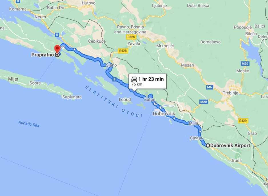 We, at Monterrasol Travel, aside from multi-day small group tours, offering also inter-city and inter-country long distance small group transfers. Such transfers can be extended with one or few (up to 3) sidetrips, by request. Here on this page we provide the price and details for long distance transfer in Croatia, from well known Dubrovnik airport Cilipi (Čilipi) to Prapratno. The price is for a ride, not per person. The transfer route will not use any highway, and there is no any ferry on the route. The price is also include 20 minutes of waiting, it is apply everywhere except airports. In airports, the price is include 1 hour waiting. If you plan to return on the same day, our driver can bring you back with a 20% discount. Each transfer back is case-by-case and depends on the total distance and waiting time. We use for transfers a classic minivans, with 7 seats for passengers (one in front, 3 on the second row, and another 3 on third row), and trunk can accommodate 2 large suitcases and few handbags. Please be aware: