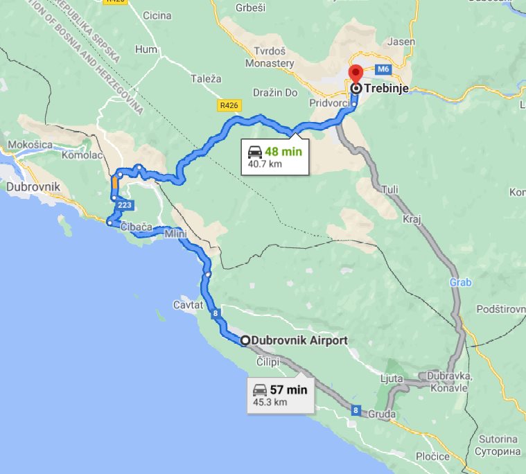 We, at Monterrasol Travel, aside from multi-day small group tours, offering also inter-city and inter-country long distance small group transfers. Such transfers can be extended with one or few (up to 3) sidetrips, by request. Here on this page we provide the price and details for long distance transfer from well known Dubrovnik airport Cilipi (Čilipi), located in Croatia, to the popular destination, Trebinje, located in Bosnia and Herzegovina. The price is for a ride, not per person. The transfer route will not use any highway, and there is no any ferry on the route. The price is also include 20 minutes of waiting, it is apply everywhere except airports. In airports, the price is include 1 hour waiting. If you plan to return on the same day, our driver can bring you back with a 20% discount. Each transfer back is case-by-case and depends on the total distance and waiting time. We use for transfers a classic minivans, with 7 seats for passengers (one in front, 3 on the second row, and another 3 on third row), and trunk can accommodate 2 large suitcases and few handbags. Please be aware: