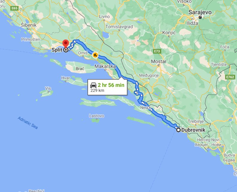 We, at Monterrasol Travel, aside from multi-day small group tours, offering also inter-city and inter-country long distance small group transfers. Such transfers can be extended with one or few (up to 3) sidetrips, by request. Here on this page we provide the price and details for long distance transfer in Croatia, from well known Dubrovnik to Split. The price is for a ride, not per person. The transfer route will partially use a highway, and the price for transfer is include the highway tolls fee. During this transfer, there is no any ferry on the route. The price is also include 20 minutes of waiting, it is apply everywhere except airports. In airports, the price is include 1 hour waiting. If you plan to return on the same day, our driver can bring you back with a 20% discount. Each transfer back is case-by-case and depends on the total distance and waiting time. We use for transfers a classic minivans, with 7 seats for passengers (one in front, 3 on the second row, and another 3 on third row), and trunk can accommodate 2 large suitcases and few handbags. Please be aware: