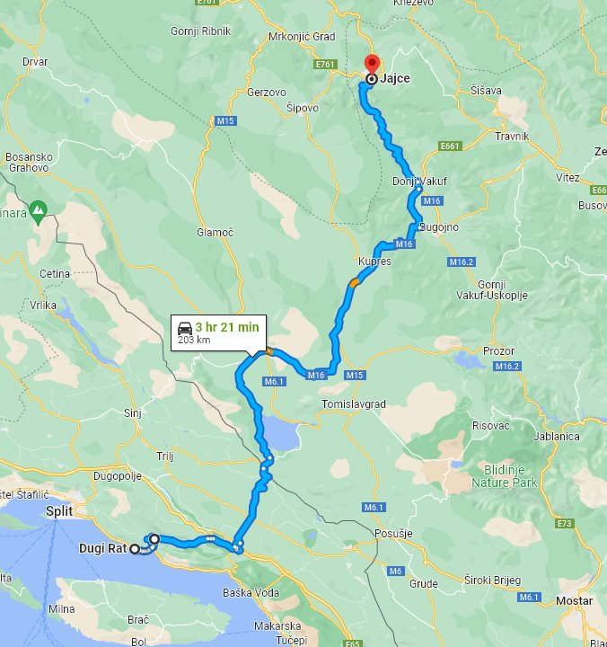 We, at Monterrasol Travel, aside from multi-day small group tours, offering also inter-city and inter-country long distance small group transfers. Such transfers can be extended with one or few (up to 3) sidetrips, by request. Here on this page we provide the price and details for long distance transfer from well known Dugi Rat, located in Croatia, to the popular destination, Jajce, located in Bosnia and Herzegovina. The price is for a ride, not per person. The transfer route will not use any highway, and there is no any ferry on the route. The price is also include 20 minutes of waiting, it is apply everywhere except airports. In airports, the price is include 1 hour waiting. If you plan to return on the same day, our driver can bring you back with a 20% discount. Each transfer back is case-by-case and depends on the total distance and waiting time. We use for transfers a classic minivans, with 7 seats for passengers (one in front, 3 on the second row, and another 3 on third row), and trunk can accommodate 2 large suitcases and few handbags. Please be aware: