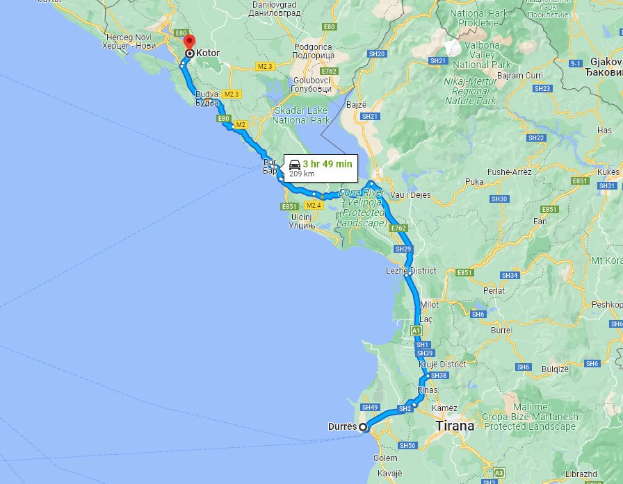 We, at Monterrasol Travel, aside from multi-day small group tours, offering also inter-city and inter-country long distance small group transfers. Such transfers can be extended with one or few (up to 3) sidetrips, by request. Here on this page we provide the price and details for long distance transfer from well known Durres (Durrës), located in Albania, to the popular destination, Kotor, located in Montenegro. The price is for a ride, not per person. The transfer route will partially use a highway, and the price for transfer is include the highway tolls fee. During this transfer, there is no any ferry on the route. The price is also include 20 minutes of waiting, it is apply everywhere except airports. In airports, the price is include 1 hour waiting. If you plan to return on the same day, our driver can bring you back with a 20% discount. Each transfer back is case-by-case and depends on the total distance and waiting time. We use for transfers a classic minivans, with 7 seats for passengers (one in front, 3 on the second row, and another 3 on third row), and trunk can accommodate 2 large suitcases and few handbags. Please be aware:
