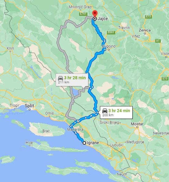 We, at Monterrasol Travel, aside from multi-day small group tours, offering also inter-city and inter-country long distance small group transfers. Such transfers can be extended with one or few (up to 3) sidetrips, by request. Here on this page we provide the price and details for long distance transfer from well known Igrane, located in Croatia, to the popular destination, Jajce, located in Bosnia and Herzegovina. The price is for a ride, not per person. The transfer route will not use any highway, and there is no any ferry on the route. The price is also include 20 minutes of waiting, it is apply everywhere except airports. In airports, the price is include 1 hour waiting. If you plan to return on the same day, our driver can bring you back with a 20% discount. Each transfer back is case-by-case and depends on the total distance and waiting time. We use for transfers a classic minivans, with 7 seats for passengers (one in front, 3 on the second row, and another 3 on third row), and trunk can accommodate 2 large suitcases and few handbags. Please be aware:
