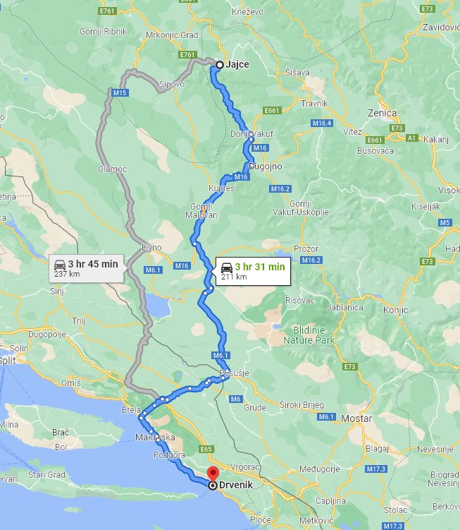 We, at Monterrasol Travel, aside from multi-day small group tours, offering also inter-city and inter-country long distance small group transfers. Such transfers can be extended with one or few (up to 3) sidetrips, by request. Here on this page we provide the price and details for long distance transfer from well known Jajce, located in Bosnia and Herzegovina, to the popular destination, Drvenik, located in Croatia. The price is for a ride, not per person. The transfer route will not use any highway, and there is no any ferry on the route. The price is also include 20 minutes of waiting, it is apply everywhere except airports. In airports, the price is include 1 hour waiting. If you plan to return on the same day, our driver can bring you back with a 20% discount. Each transfer back is case-by-case and depends on the total distance and waiting time. We use for transfers a classic minivans, with 7 seats for passengers (one in front, 3 on the second row, and another 3 on third row), and trunk can accommodate 2 large suitcases and few handbags. Please be aware: