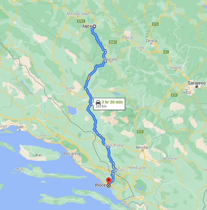 We, at Monterrasol Travel, aside from multi-day small group tours, offering also inter-city and inter-country long distance small group transfers. Such transfers can be extended with one or few (up to 3) sidetrips, by request. Here on this page we provide the price and details for long distance transfer from well known Jajce, located in Bosnia and Herzegovina, to the popular destination, Ploce (Ploče), located in Croatia. The price is for a ride, not per person. The transfer route will not use any highway, and there is no any ferry on the route. The price is also include 20 minutes of waiting, it is apply everywhere except airports. In airports, the price is include 1 hour waiting. If you plan to return on the same day, our driver can bring you back with a 20% discount. Each transfer back is case-by-case and depends on the total distance and waiting time. We use for transfers a classic minivans, with 7 seats for passengers (one in front, 3 on the second row, and another 3 on third row), and trunk can accommodate 2 large suitcases and few handbags. Please be aware:
