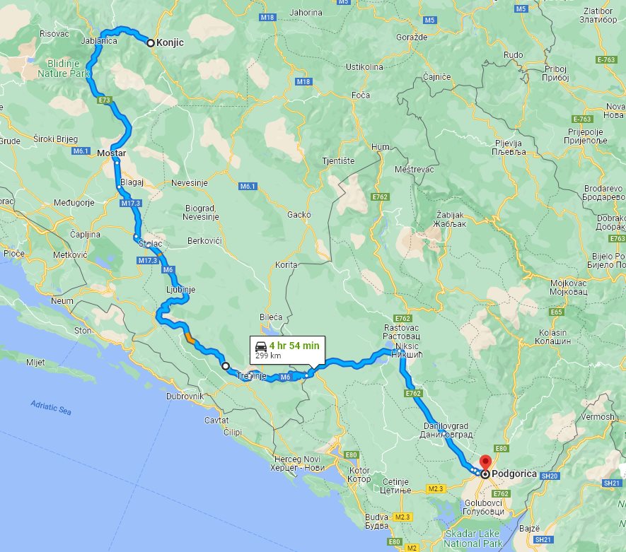 Transfer from Konjic, Bosnia and Herzegovina to Podgorica, Montenegro