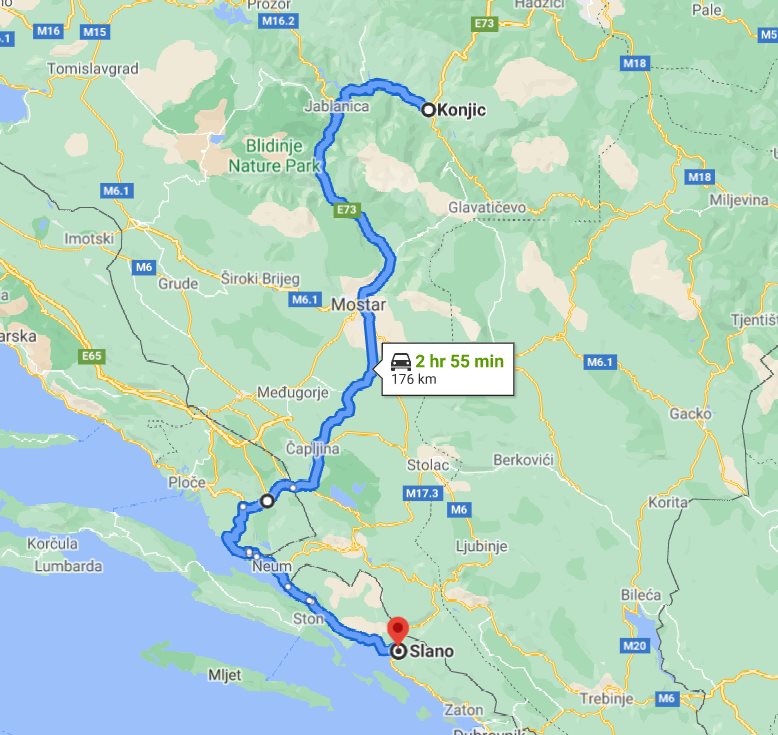 We, at Monterrasol Travel, aside from multi-day small group tours, offering also inter-city and inter-country long distance small group transfers. Such transfers can be extended with one or few (up to 3) sidetrips, by request. Here on this page we provide the price and details for long distance transfer from well known Konjic, located in Bosnia and Herzegovina, to the popular destination, Slano, located in Croatia. The price is for a ride, not per person. The transfer route will not use any highway, and there is no any ferry on the route. The price is also include 20 minutes of waiting, it is apply everywhere except airports. In airports, the price is include 1 hour waiting. If you plan to return on the same day, our driver can bring you back with a 20% discount. Each transfer back is case-by-case and depends on the total distance and waiting time. We use for transfers a classic minivans, with 7 seats for passengers (one in front, 3 on the second row, and another 3 on third row), and trunk can accommodate 2 large suitcases and few handbags. Please be aware: