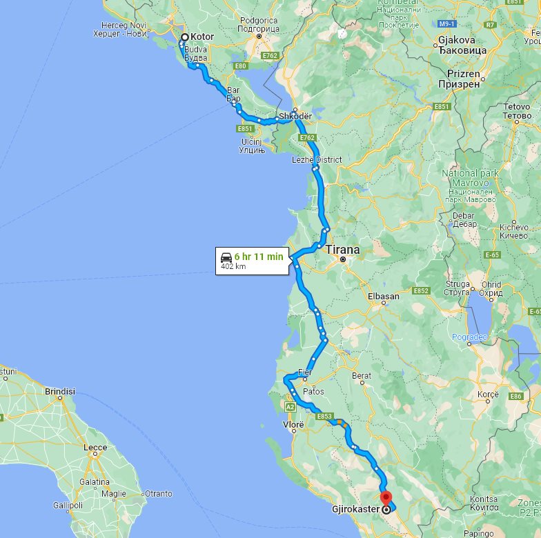 Here on this page we provide the price and details for long distance transfer from well known Kotor, located in Montenegro, to the popular destination, Gjirokaster (Gjirokastër), located in Albania.