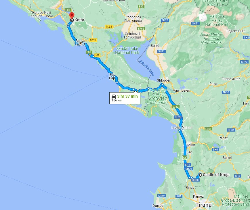We, at Monterrasol Travel, aside from multi-day small group tours, offering also inter-city and inter-country long distance small group transfers. Such transfers can be extended with one or few (up to 3) sidetrips, by request. Here on this page we provide the price and details for long distance transfer from well known Kruje (Krujë), located in Albania, to the popular destination, Kotor, located in Montenegro. The price is for a ride, not per person. The transfer route will not use any highway, and there is no any ferry on the route. The price is also include 20 minutes of waiting, it is apply everywhere except airports. In airports, the price is include 1 hour waiting. If you plan to return on the same day, our driver can bring you back with a 20% discount. Each transfer back is case-by-case and depends on the total distance and waiting time. We use for transfers a classic minivans, with 7 seats for passengers (one in front, 3 on the second row, and another 3 on third row), and trunk can accommodate 2 large suitcases and few handbags. Please be aware: