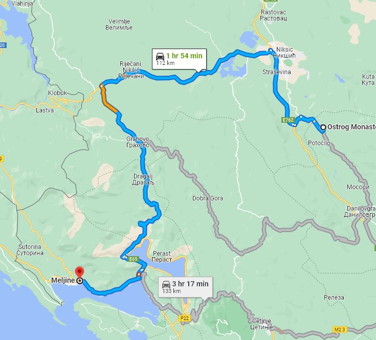 We, at Monterrasol Travel, aside from multi-day small group tours, offering also inter-city and inter-country long distance small group transfers. Such transfers can be extended with one or few (up to 3) sidetrips, by request. Here on this page we provide the price and details for long distance transfer in Montenegro, from well known Ostrog monastery to Meljine. The price is for a ride, not per person. The transfer route will not use any highway, and there is no any ferry on the route. The price is also include 20 minutes of waiting, it is apply everywhere except airports. In airports, the price is include 1 hour waiting. If you plan to return on the same day, our driver can bring you back with a 20% discount. Each transfer back is case-by-case and depends on the total distance and waiting time. We use for transfers a classic minivans, with 7 seats for passengers (one in front, 3 on the second row, and another 3 on third row), and trunk can accommodate 2 large suitcases and few handbags. Please be aware: