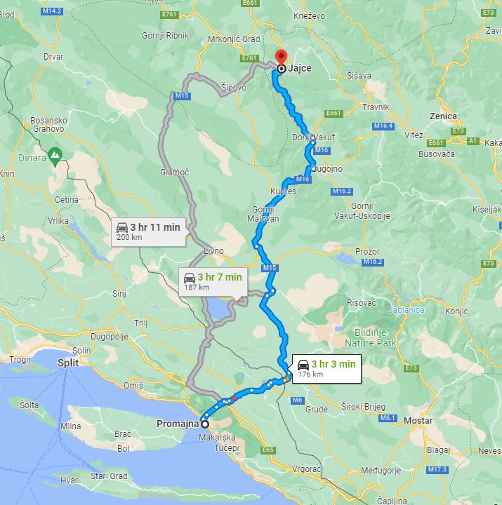 We, at Monterrasol Travel, aside from multi-day small group tours, offering also inter-city and inter-country long distance small group transfers. Such transfers can be extended with one or few (up to 3) sidetrips, by request. Here on this page we provide the price and details for long distance transfer from well known Promajna, located in Croatia, to the popular destination, Jajce, located in Bosnia and Herzegovina. The price is for a ride, not per person. The transfer route will not use any highway, and there is no any ferry on the route. The price is also include 20 minutes of waiting, it is apply everywhere except airports. In airports, the price is include 1 hour waiting. If you plan to return on the same day, our driver can bring you back with a 20% discount. Each transfer back is case-by-case and depends on the total distance and waiting time. We use for transfers a classic minivans, with 7 seats for passengers (one in front, 3 on the second row, and another 3 on third row), and trunk can accommodate 2 large suitcases and few handbags. Please be aware: