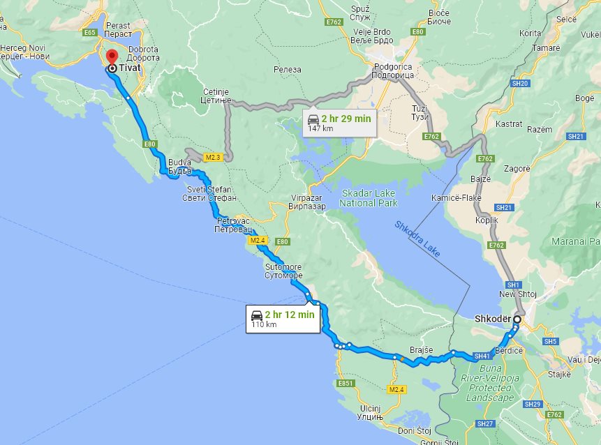 We, at Monterrasol Travel, aside from multi-day small group tours, offering also inter-city and inter-country long distance small group transfers. Such transfers can be extended with one or few (up to 3) sidetrips, by request. Here on this page we provide the price and details for long distance transfer from well known Shkoder (Shkodër), located in Albania, to the popular destination, Tivat, located in Montenegro. The price is for a ride, not per person. The transfer route will not use any highway, and there is no any ferry on the route. The price is also include 20 minutes of waiting, it is apply everywhere except airports. In airports, the price is include 1 hour waiting. If you plan to return on the same day, our driver can bring you back with a 20% discount. Each transfer back is case-by-case and depends on the total distance and waiting time. We use for transfers a classic minivans, with 7 seats for passengers (one in front, 3 on the second row, and another 3 on third row), and trunk can accommodate 2 large suitcases and few handbags. Please be aware: