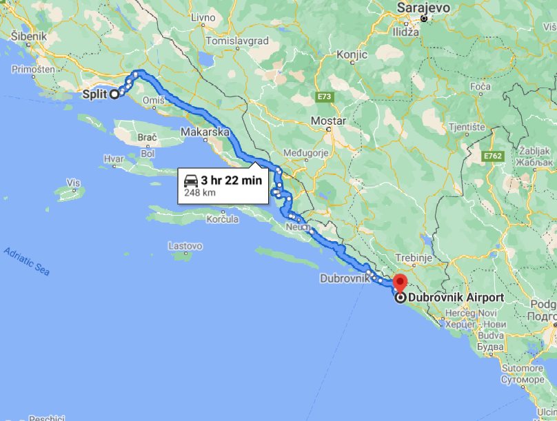 We, at Monterrasol Travel, aside from multi-day small group tours, offering also inter-city and inter-country long distance small group transfers. Such transfers can be extended with one or few (up to 3) sidetrips, by request. Here on this page we provide the price and details for long distance transfer in Croatia, from well known Split to Dubrovnik airport Cilipi (Čilipi). The price is for a ride, not per person. The transfer route will partially use a highway, and the price for transfer is include the highway tolls fee. During this transfer, there is no any ferry on the route. The price is also include 20 minutes of waiting, it is apply everywhere except airports. In airports, the price is include 1 hour waiting. If you plan to return on the same day, our driver can bring you back with a 20% discount. Each transfer back is case-by-case and depends on the total distance and waiting time. We use for transfers a classic minivans, with 7 seats for passengers (one in front, 3 on the second row, and another 3 on third row), and trunk can accommodate 2 large suitcases and few handbags. Please be aware: