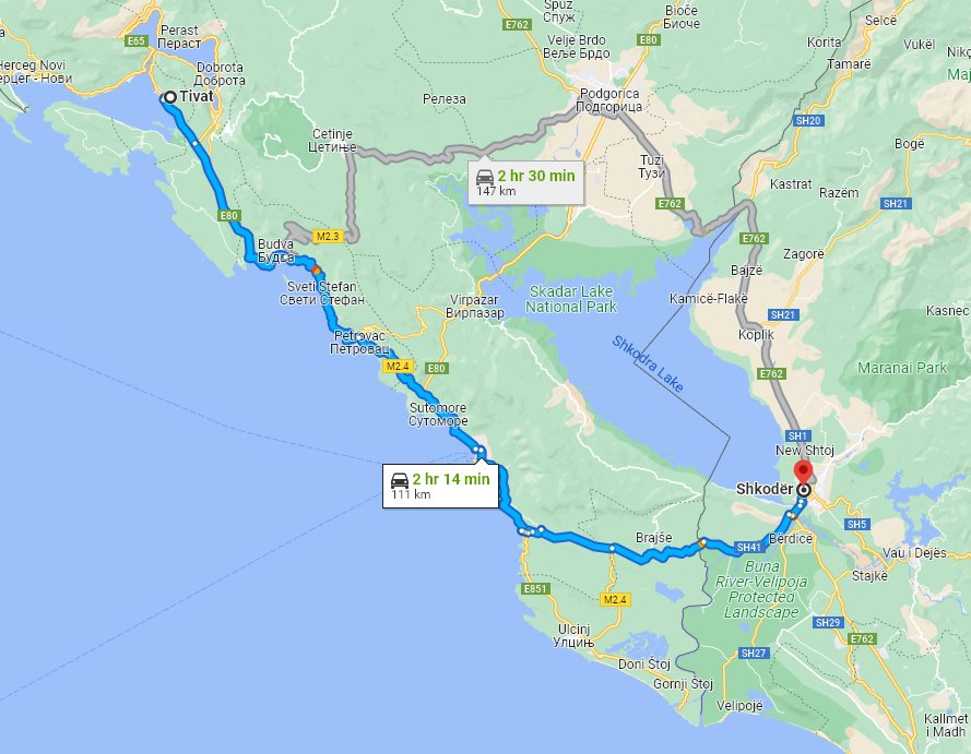 We, at Monterrasol Travel, aside from multi-day small group tours, offering also inter-city and inter-country long distance small group transfers. Such transfers can be extended with one or few (up to 3) sidetrips, by request. Here on this page we provide the price and details for long distance transfer from well known Tivat, located in Montenegro, to the popular destination, Shkoder (Shkodër), located in Albania. The price is for a ride, not per person. The transfer route will not use any highway, and there is no any ferry on the route. The price is also include 20 minutes of waiting, it is apply everywhere except airports. In airports, the price is include 1 hour waiting. If you plan to return on the same day, our driver can bring you back with a 20% discount. Each transfer back is case-by-case and depends on the total distance and waiting time. We use for transfers a classic minivans, with 7 seats for passengers (one in front, 3 on the second row, and another 3 on third row), and trunk can accommodate 2 large suitcases and few handbags. Please be aware: