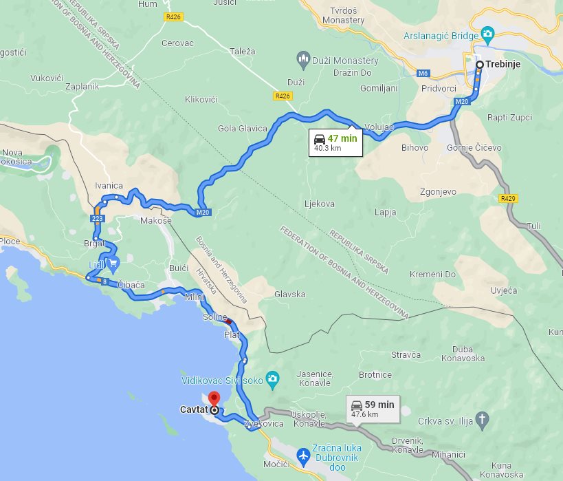 We, at Monterrasol Travel, aside from multi-day small group tours, offering also inter-city and inter-country long distance small group transfers. Such transfers can be extended with one or few (up to 3) sidetrips, by request. Here on this page we provide the price and details for long distance transfer from well known Trebinje, located in Bosnia and Herzegovina, to the popular destination, Cavtat, located in Croatia. The price is for a ride, not per person. The transfer route will not use any highway, and there is no any ferry on the route. The price is also include 20 minutes of waiting, it is apply everywhere except airports. In airports, the price is include 1 hour waiting. If you plan to return on the same day, our driver can bring you back with a 20% discount. Each transfer back is case-by-case and depends on the total distance and waiting time. We use for transfers a classic minivans, with 7 seats for passengers (one in front, 3 on the second row, and another 3 on third row), and trunk can accommodate 2 large suitcases and few handbags. Please be aware:
