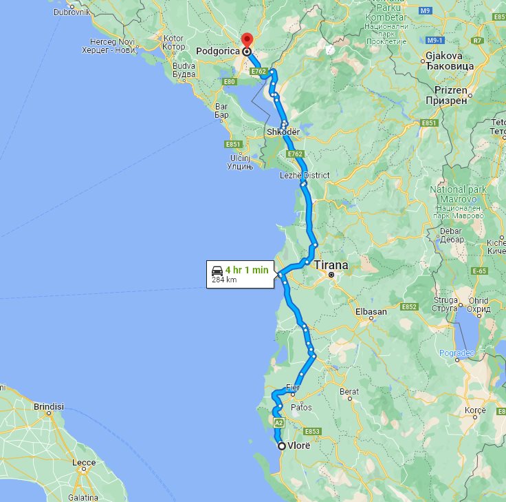 Here on this page we provide the price and details for long distance transfer from well known Vlore (Vlorë), located in Albania, to the popular destination, Podgorica, located in Montenegro.